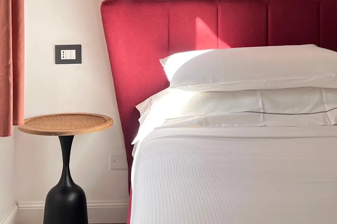 La camera Studio, un tempo era lo studio della Dimora, protagonisti sono i soffitti che disegnano eleganti geometrie in stile barocco creando un connubio unico con le sapienti scelte cromatiche dei colori pastello come il terracotta.